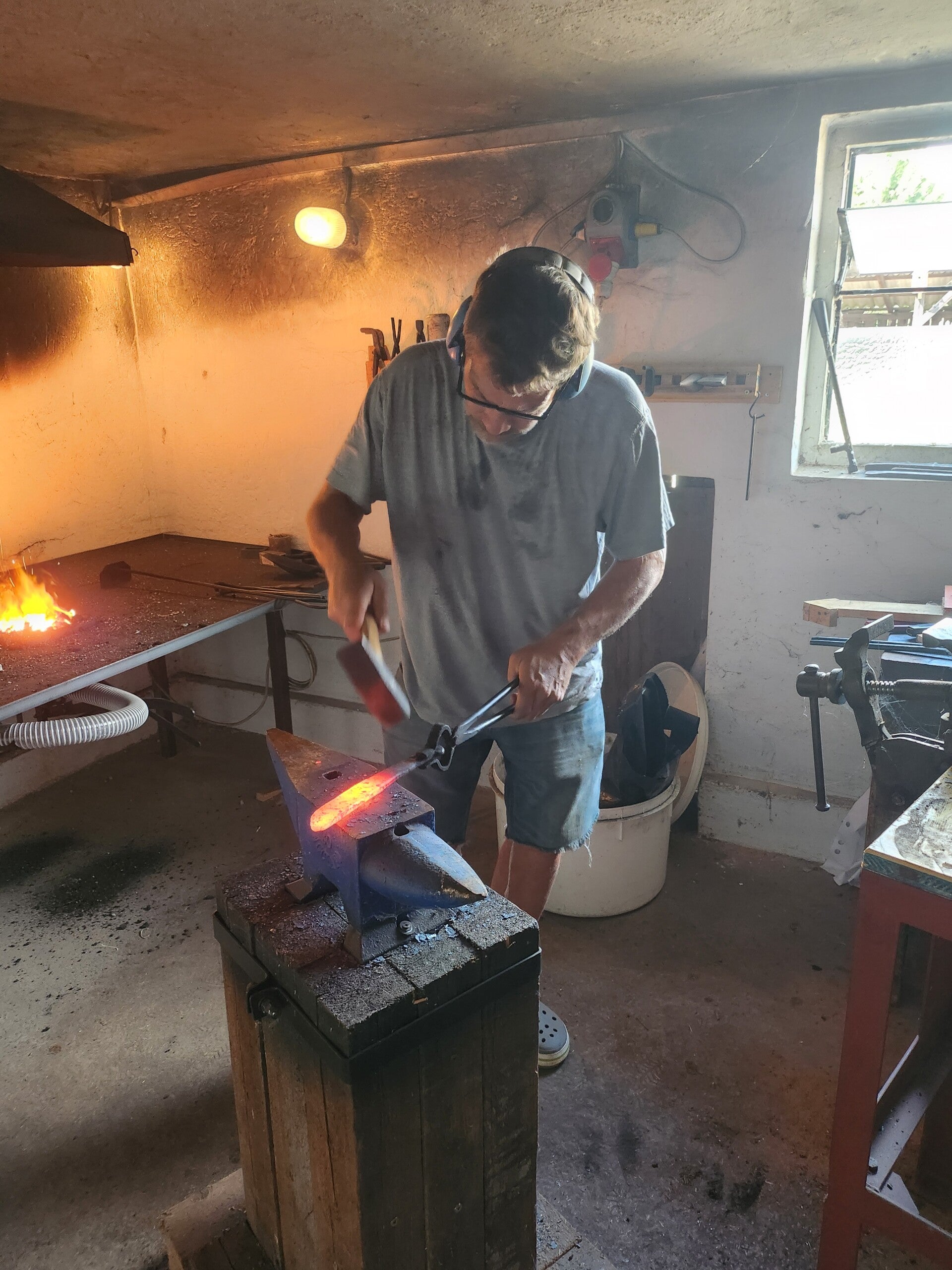 Ich bin ein ruhiger, erfahrener und bodenständiger Handwerker, geprägt durch vielfältige Lebens- und Arbeitsbereiche sowie eine Familiengeschichte, in der Handwerk immer eine wichtige Rolle gespielt hat. 2018 habe ich mein erstes Messer geschmiedet, und die Faszination für die Entwicklung eigener Werkstücke hat mich seither nicht mehr losgelassen. In meiner Schmiede entstehen ausschließlich handgefertigte Unikate, bei denen jedes Stück seine eigene Identität trägt und weit entfernt ist von industrieller Massenware. Mir ist wichtig, dass Kunden sich mit ihrem Messer identifizieren können – genauso wie Kursteilnehmer erleben, wie besonders es ist, unter Hitze und Hammer ihr eigenes Werkstück zu formen. So entsteht nicht nur ein langlebiges Werkzeug, sondern ein persönliches Erlebnis, das man nicht überall bekommt.